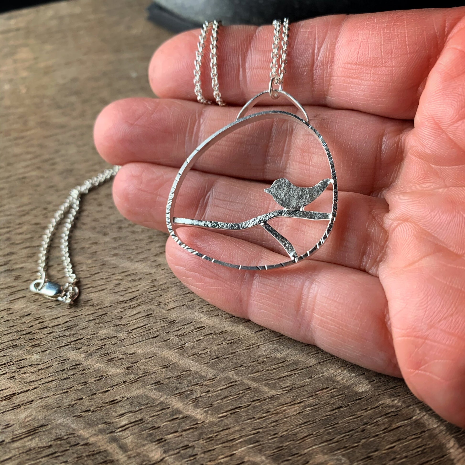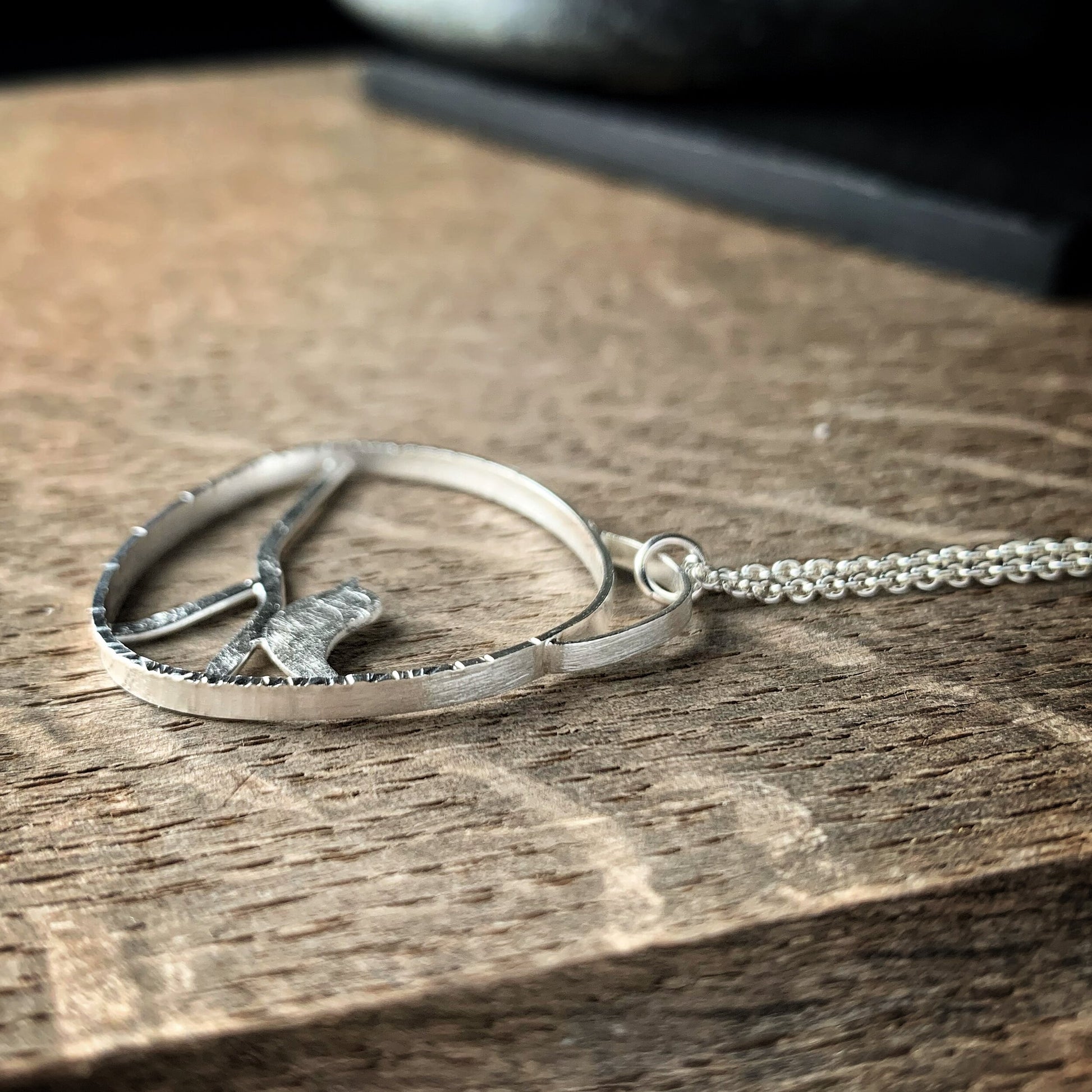 The old version of this pendant had been a favorite online and at shows for years and years and, frankly, I got bored making it. It didn’t feel like the work I have been currently making so I gave it an update! I LOVE the new design. PLEASE NOTE: No two of these will be the same. They will be similar, but I will make yours for YOU and nobody else so it’ll be totally unique. The outside frame has an ombré hammered texture with hammered branches and a matte finished bird.